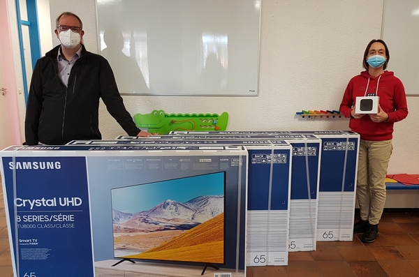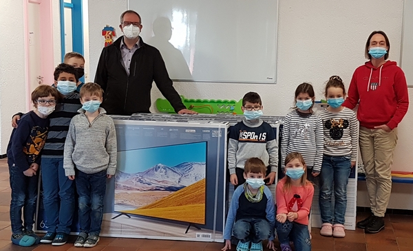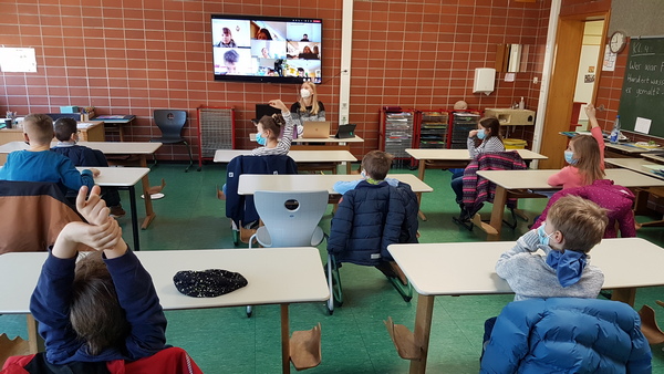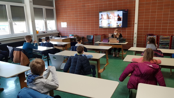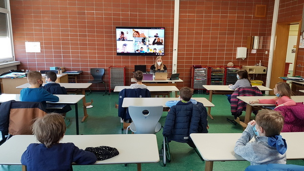 Jeder Klassenraum bekommt nun ein eigenes TV-Gerät. Die Kinder, die im Wechselunterricht von daheim zugeschaltet werden, sind wie live dabei.